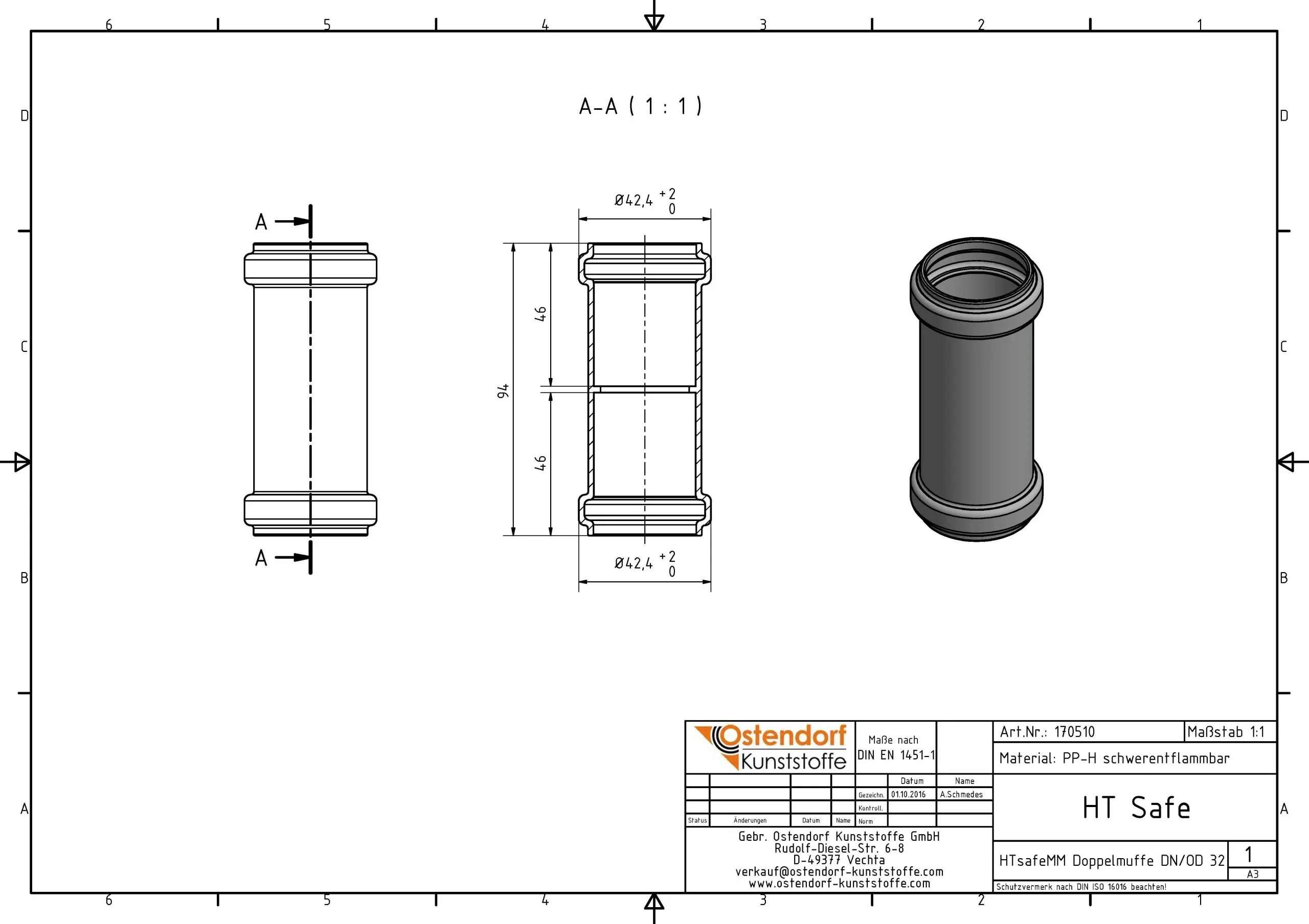 Ostendorf HTsafe HTsafe-Doppelmuffe 170510 DN/OD 32