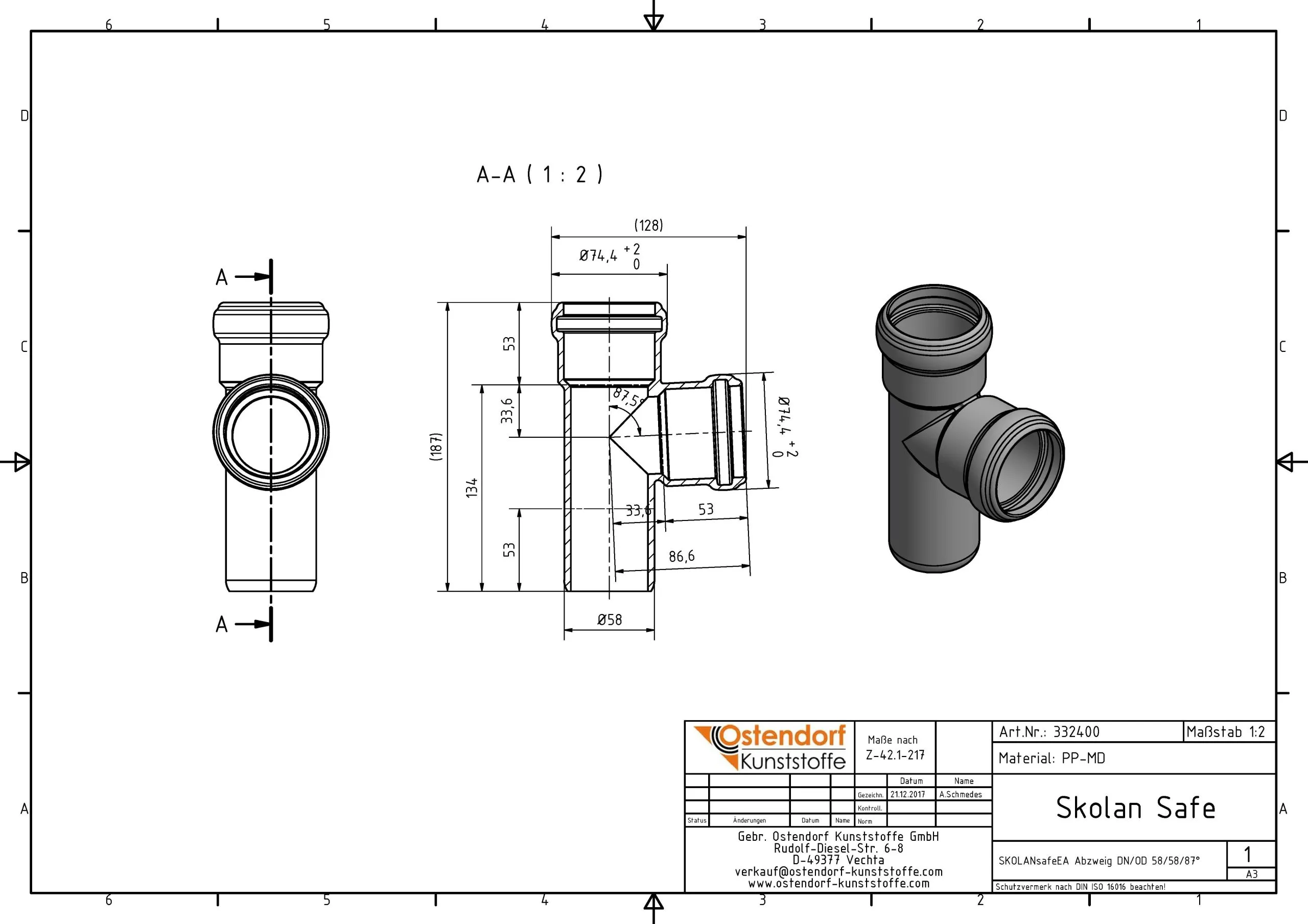 Ostendorf SKOLAN Safe SKOLANsafe-Abzweig 332400 DN/OD 58/58 X 87,5°